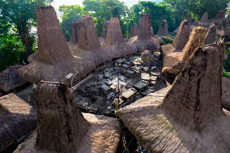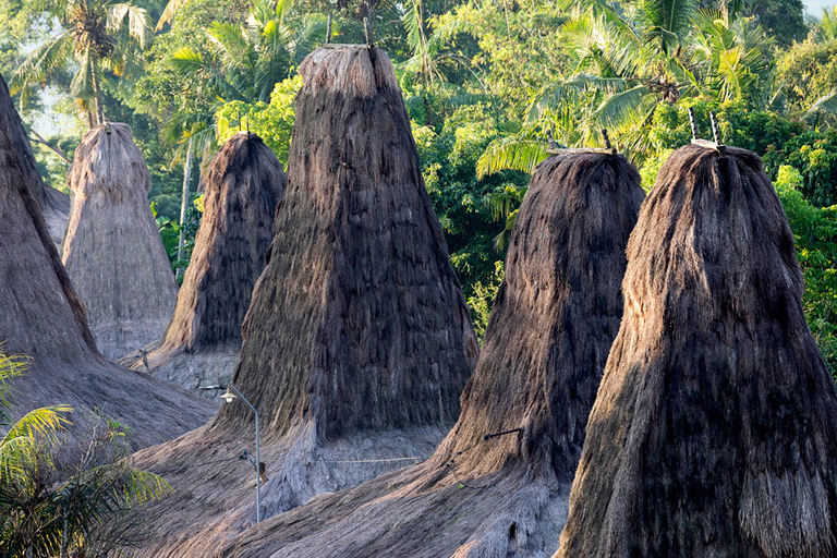 Vasici Tarung in Praijing, skriti na vrhu gričev, sta popolna primera tega, kar dela otok Sumba tako posebnega. Že sam pristop k njima ponuja čudovite razglede na riževa polja naokrog, a prava čarobnost se začne, ko se znajdeš med tradicionalnimi hišami. Sredi vasi ležijo mogočne kamnite grobnice prednikov, okrog njih pa se dvigajo hiše z izjemno visokimi, stožčastimi strehami iz trave — nekatere merijo kar 20 do 30 metrov visoko. Te strehe niso le arhitekturni čudež, temveč nosijo simboliko treh svetov: zgornjega, kjer prebivajo duhovi; srednjega, namenjenega ljudem in spodnjega, kjer imajo svoje mesto živali.