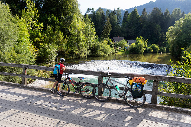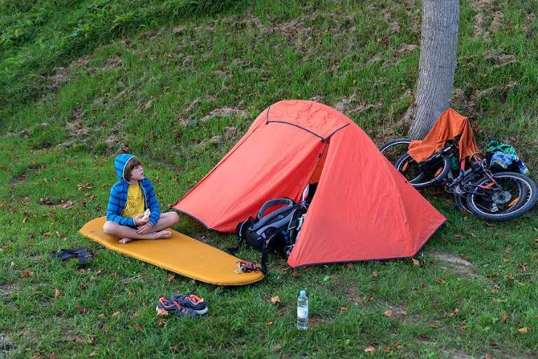 We were planning multiday trip with bicycles for some time. I always wanted to try also this way of exploring the world, but due to the lack of equipment, sometimes also the will and energy, we never did it. Well, a few days ago a friend borrowed us bike bags and due to Ana’s injury it was time for the first boy’s bike trip. Like some “bondage” of father and son. 🙂 🙂 We chose Gorenjska region for a cycling trip and when I look back I don’t even know if we spent more time in the water than on the bike. 🙂 In the Radovna valley we swam in Lake Kreda. The next day it was time to jump into Lake Bled, and in the evening to lake Bohin. We spent the only night luxuriously in the new camp near Bled – “River camping Bled”. We were both more than excited about this way of exploring the planet. There are already ideas for a longer trip but the highlight would definitely be couple of weeks long trip in a nice, remote country. :);)