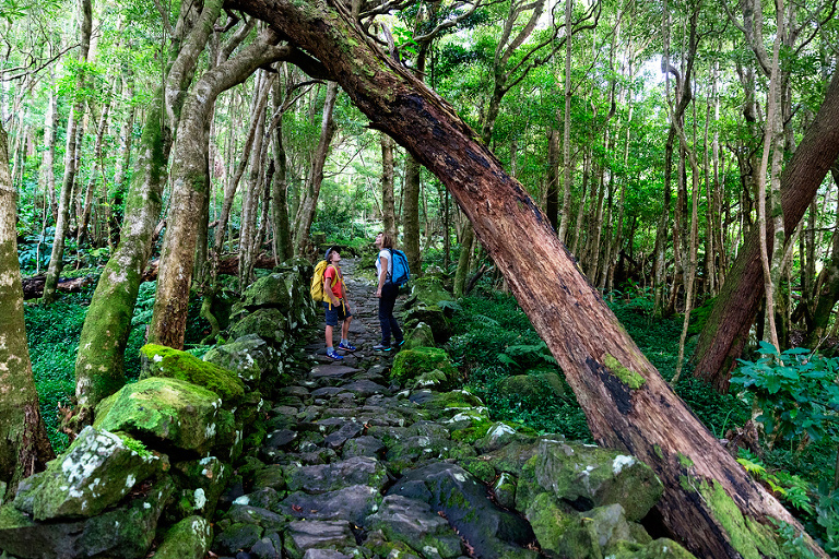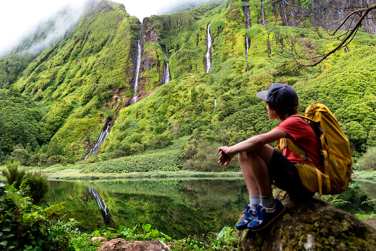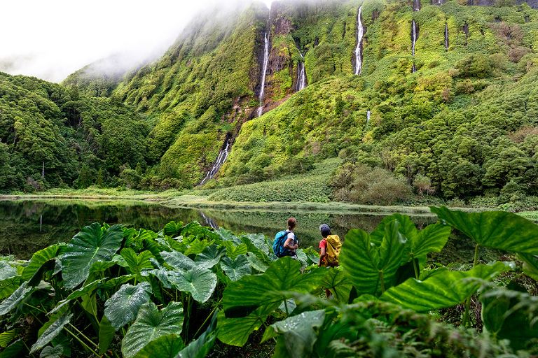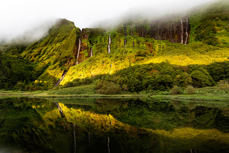 Če je kakšna lokacija na otoku Flores na Azorih, ki jo moraš obiskati, je to zagotovo Poço Ribeira do Ferreiro. Od vasice Faja Grande, kjer smo kampirali vse dni med našim obiskom otoka Flores, se lahko do znamenitih slapov odpraviš kar peš. Zadnji del poti od parkirišča ob glavni cesti pa vse do obronkov mogočne visoke planote poteka pot po lepi kamniti stezi v res idiličnem okolju. Da vidiš slapove in jezero v najlepši luči, rabiš “poln kufer” sreče in mi smo jo tisti prvi večer po našem prihodu na otok Flores tudi imeli. Ob našem petdnevnem postanku na otoku so bili slapovi lepo vidni le tisti večer – vse ostale dni je bila glavna pozerka megla. 🙂