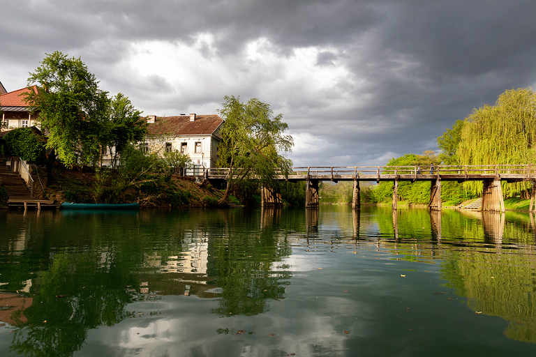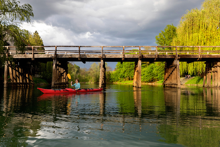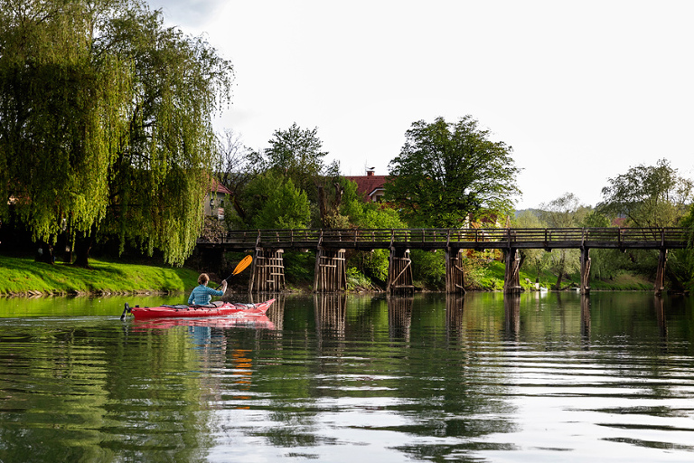 The kayak trip started a few kilometers up the Krka River, near the idyllic Otočec Castle. The Otočec – Kostanjevica na Krki kayak tour is known among sea kayakers, as it offers a good amount of calm water among beautiful places in the Dolenjska region. Since the tour is only possible in one direction, only me and my son started the first part of the trip and we were enjoying in perfect water condition, observing the abundance of wild animals on the way and it was also time for the first pike fishing this year. 🙂 The tour would definitely be interesting for some SUP enthusiasts as well. The tour is the most beautiful at the beginning and towards the end, where we were also surprised by the creations of local beavers. In Kostanjevica na Krki, the wife joined the short rowing trip and kayaking around Kostanjevica ob Krki, under the mighty wooden bridges at the end of the day was a real pleasure. Well, all that was missing was a jump into the water, but you have to leave something for another visit. 😉