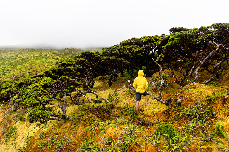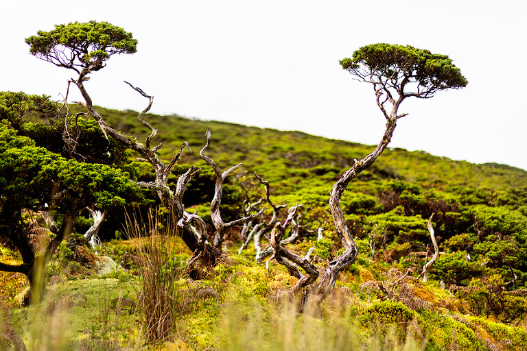 Čas je za zadnjo objavo o čarobnem otoku Flores na Azorih. O Azorih sem kar nekaj napisal že v prejšnjih objavah, ki jih najdete TUKAJ, tokrat pa nekaj fotografij visoke planote otoka Flores. Da vidiš pokrajino planote Floresa v polnem sijaju, potrebuješ konkretno porcijo sreče. 🙂 Kljub temu, da smo bili na otoku 4 polne dni, je bil osrednji del otoka praktično non stop zavit v meglo oziroka nizko oblačnost ali pa je padalo kot da že dolgo ne bi. 🙂 Osrednji plato otoka ponuja kar nekaj res dobrih lokacij, najbolj izstopajo fotogenična jezera v vulkanskih kraterjih, pa razgledniki in nekaj res dobrih pohodnih tur. Če vas slučajno zanese v tiste konce, toplo priporočam tudi makadamsko pot, ki pelje proti severu otoka. Pot preči res zanimivo pokrajino z ostarelimi in zakrivljenimi drevesci, posejanimi po kilometrih šotnega barja. Ko vidiš to, tudi vidiš, kam gre vsa voda, ki skoraj dnevno zaliva otok. 😉