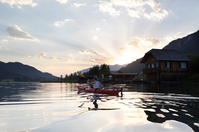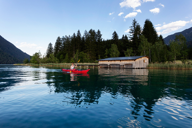 A week ago we made a short trip to one of the most beautiful lakes in neighbouring Austria – Weissensee. We wanted to visit those parts already several times in winter time (it’s a great location for skating on the frozen lake), but things were always getting out of the way. Well, a few days ago, things got together and we took our kayaks instead of skates to the lake. The kayaking tour was excellent, but the lake is also great for a SUP trip or to take a dip in these hot summer days – it is such a nice alternative to the sea.