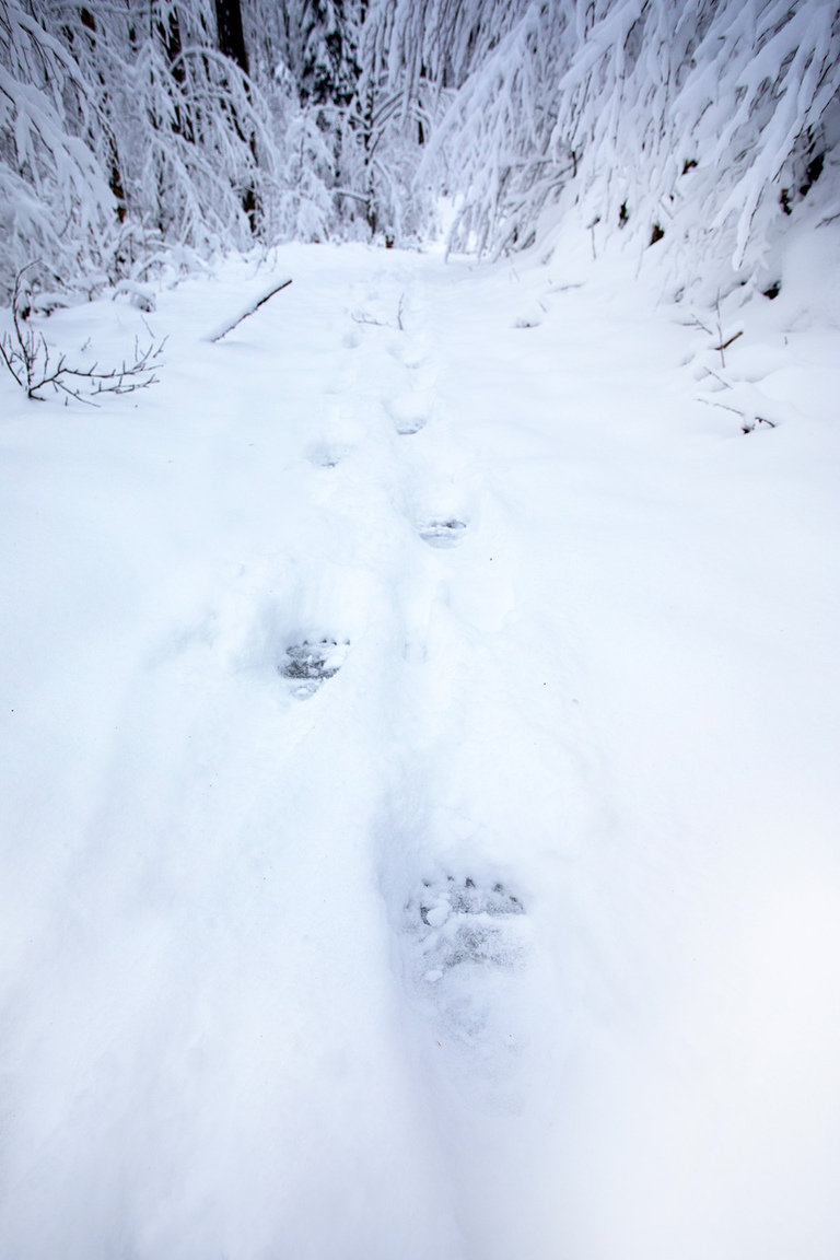 Ker je dež ob reki Krki že v petek uničil novozapadel sneg, sva z ženo v iskanju tiste prave snežne kulise v soboto zavila malo višje. Cesta do Baze 20 je običajno splužena že takoj po sneženju in tokrat ni bilo nič drugače. In če je bilo v dolini snega le za vzorec, so bile snežne razmere v hribih odlične in hoja po sveže zasneženi poti in pršiču je bila klasa zase. 🙂 No, potem pa so se začeli heci. Ko sem sam fotografiral zasneženo gmajno, se žena pred menoj kot vkopana ustavi sredi poti in zatopljeno gleda v zasnežena tla. In vse kar je znala povedati je bilo samo “a je to to kar mislim?”. 🙂 🙂 Lepe sveže stopinje medveda so nama govorile, da je bil medved očitno namenjen proti nama, se zaradi naju ustavil in potem odvandral v drugo smer. Ko sem ženo le nekako prepričal, da je tale mrcina šla, sva s potjo nadaljevala do bolnice Jelendol, ki se skriva le kakšna dva kilometra stran. In ko sva bila od bolnice oddaljena le še nekaj sto metrov, pa spet – tokrat še enkrat večje stopinje, medo pa na isti poti v isto smer. 🙂 🙂 No, žena je tisti trenutek rekla, da je snega, predvsem pa medvedov dovolj. 🙂 🙂